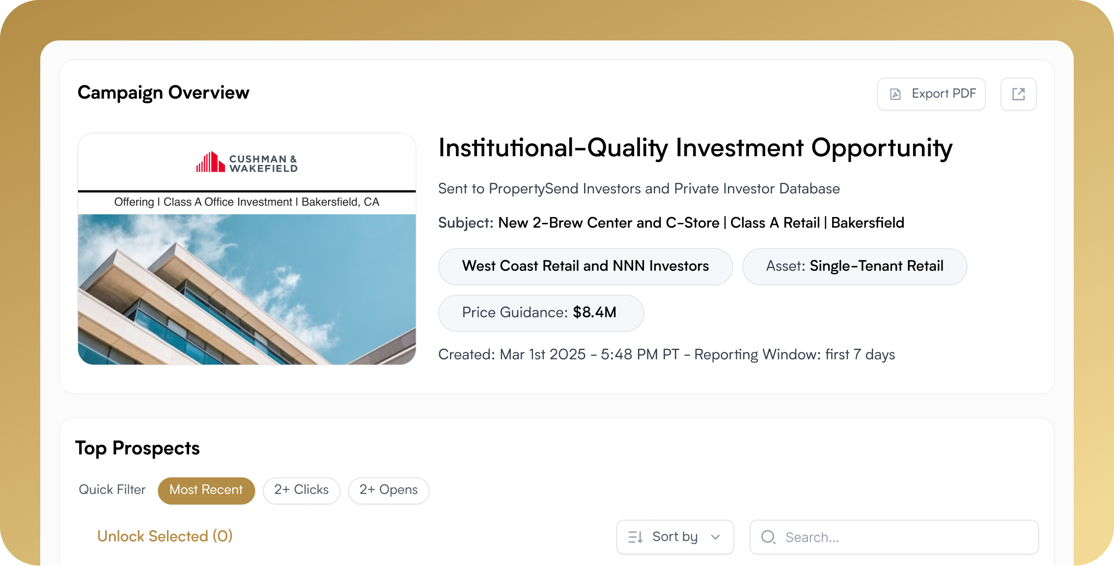 PropertySend connects engagement directly to prospects. Instead of guessing who your campaign reached, you can sort and filter by opens, clicks, and recency to identify the most engaged prospects, then use tokens to reveal contact details and prioritize outreach with confidence. It’s a faster path from interest to informed follow-up.